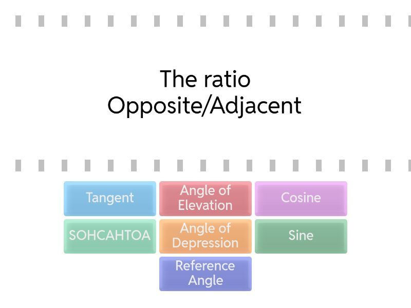 Tangent - The ratio Opposite/Adjacent, Angle of Elevation - The angle between a horizontal line and the line of sight to an object that is above that horizontal line., Angle of Depression - The angle between a horizontal line from an observer's eye and the line of sight to an object below that horizontal line., Sine - The ratio Opposite/Hypotenuse, Cosine - The ratio Adjacent/Hypotenuse, Reference Angle - The angle used to determine which trigonometric function to utilize., SOHCAHTOA - Sine = Opposite / Hypotenuse, Cosine = Adjacent / Hypotenuse, and Tangent = Opposite / Adjacent,