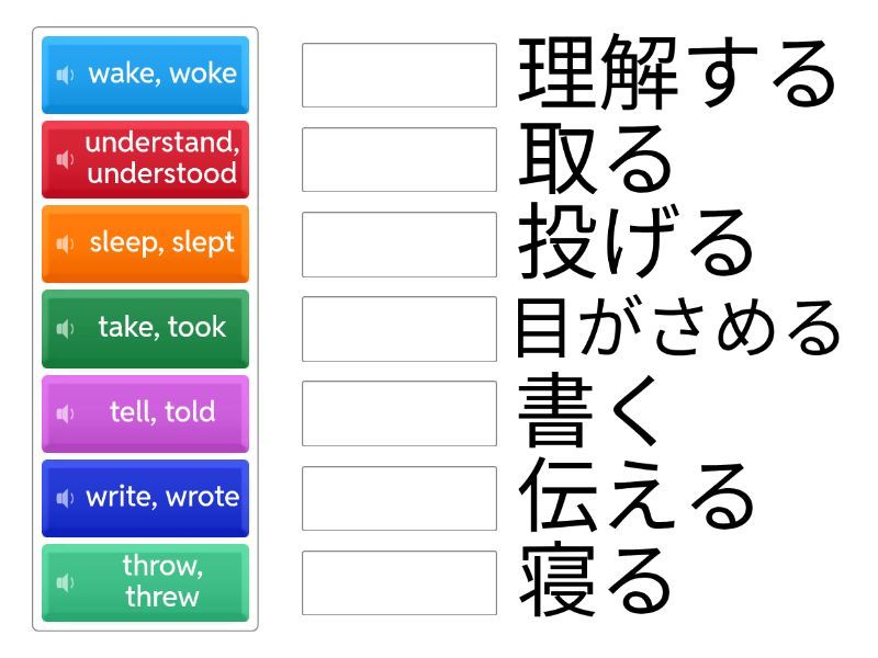 sleep, slept - 寝る, speak, spoke - 話す, stand, stood - 立つ, swim, swam - 泳ぐ, take, took - 取る, teach, taught - 教える, tell, told - 伝える, think, thought - 考える, throw, threw - 投げる, understand, understood - 理解する, wake, woke - 目がさめる, win, won - 勝つ, write, wrote - 書く,