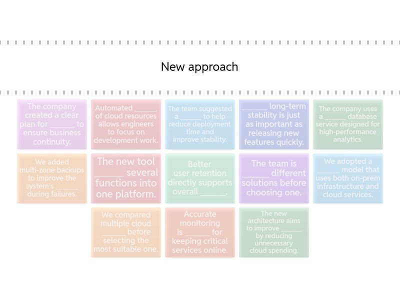 The team suggested a ______ to help reduce deployment time and improve stability. - New approach, Automated ______ of cloud resources allows engineers to focus on development work. - Provisioning, We added multi-zone backups to improve the system’s ______ during failures. - Resilience, The new architecture aims to improve ______ by reducing unnecessary cloud spending. - Cost-efficiency, The company created a clear plan for ______ to ensure business continuity. - Disaster recovery, ______ long-term stability is just as important as releasing new features quickly. - Securing, Better user retention directly supports overall ______. - Business growth, Accurate monitoring is ______ for keeping critical services online. - Critical, The team is ______ different solutions before choosing one. - Exploring, We adopted a ______ model that uses both on-prem infrastructure and cloud services. - Hybrid, The new tool ______ several functions into one platform. - Combines, We compared multiple cloud ______ before selecting the most suitable one. - Providers, The company uses a ______ database service designed for high-performance analytics. - Specialized,