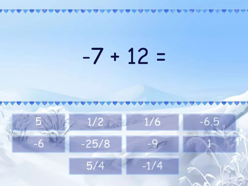 5 - -7 + 12 =, 5/4 - 3/4 + 1/2 =, -6 - -15 - (-9) =, 1/2 - 5/6 - 1/3 =, -25/8 - -4 + 7/8 =, 1 - 9/5 - 4/5 =, 1/6 - -2/3 + 5/6 =, -9 - 18 - 27 =, -6.5 - -10.5 + 4 =, -1/4 - 11/4 - 3 =,
