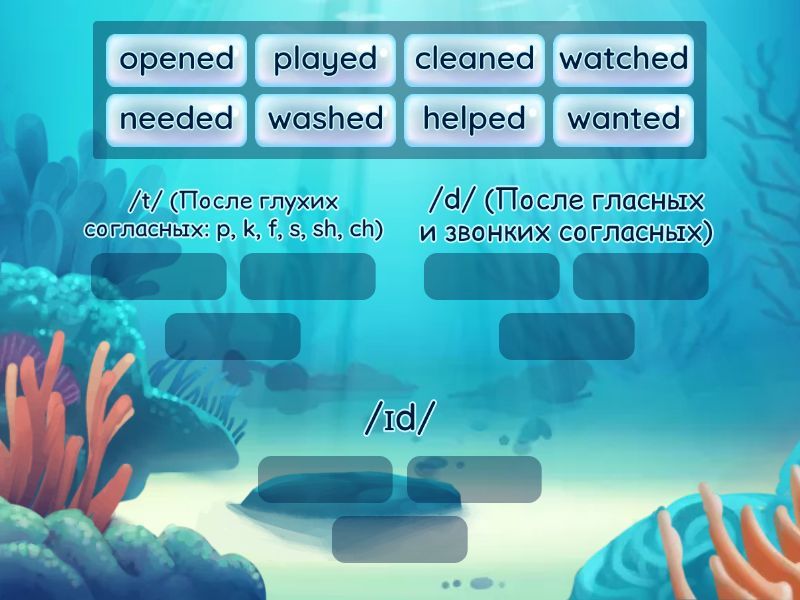 /t/ (После глухих согласных: p, k, f, s, sh, ch): washed, watched, helped, /d/ (После гласных и звонких согласных): cleaned, played, opened, /ɪd/: wanted, needed,