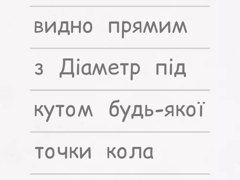 Діаметр з будь-якої точки кола видно під прямим кутом, Колом називається геометрична фігура, яка складається з усіх точок площини, рівновіддалених від даної точки, Діаметр кола, перпендикулярний до хорди, ділить її навпіл, Радіус – це відрізок, що сполучає центр з будь-якою точкою кола, Центр кола – це задана точка, від якої рівновіддалені усі точки цієї геометричної фігури, Круг – це коло разом з його внутрішньою областю, Діаметр є найбільшою з хорд, Діаметр – це хорда, що проходить через центр кола, Діаметр кола, що проходить через середину хорди, яка не є діаметром, перпендикулярний до цієї хорди., Хорда – це відрізок, що сполучає дві точки кола,