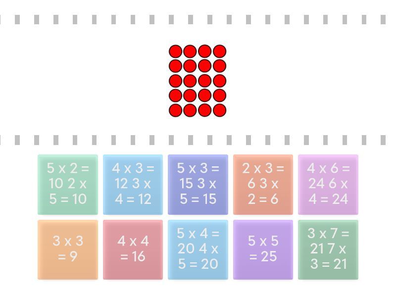5 x 4 = 20 4 x 5 = 20, 4 x 4 = 16, 3 x 3 = 9, 3 x 7 = 21 7 x 3 = 21, 4 x 6 = 24 6 x 4 = 24, 5 x 3 = 15 3 x 5 = 15, 5 x 2 = 10 2 x 5 = 10, 2 x 3 = 6 3 x 2 = 6, 5 x 5 = 25, 4 x 3 = 12 3 x 4 = 12,