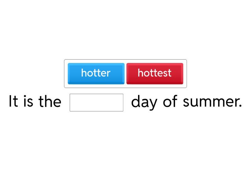 It is the ____ day of summer. My hands are ____ than his hands. I am the ____ in my class. This pig is ____ than that chicken. That is the ____ hill I've ever seen! Betsy ran ____ than James. Sandy was the ____ runner of all. The box was ____ than the bag. The whale is the ____ mammal. Sandra is ____ than Tony. The snake is ____ than the ostrich. A lion is the ____ cat of all.