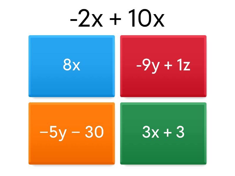 1) -2x + 10x a) 8x b) -9y + 1z c) −5y − 30 d) 3x + 3 2) 4a + 4 + 2a a) -9a b) -2x - 12 c) 3x + 3 d) 6a + 4 3) -4x + 3 + (-3x) a) 7y + 2 b) -x or -1x c) 8x d) -7x + 3 4) -5 + 3x - 7 - 5x a) -2x - 12 b) 8x + 66 c) −a + 11b d) 8x 5) -3 + 8x + 4 + (-10x) a) -2x + 1 b) -2x - 12 c) -9y + 1z d) -12x + 3y + 9 6) 13x - (-2x) + 45 - (-21) - 7x a) 14j + 9k + 12 b) 8x + 66 c) -x or -1x d) −a + 11b 7) 8y + 5 + (-y) + (-3) a) 7y + 2 b) 6a + 4 c) -9a d) -12x + 3y + 9 8) 5y + (-3x) - 9x + 1 - 2y + 8 a) -7x + 3 b) -12x + 3y + 9 c) -2x - 12 d) -2x + 10y 9) 3a + 2b − 4a + 9b a) 8y + 1z - 8 b) -2x + 1 c) -9a d) −a + 11b 10) 2x − 3x a) 7y + 2 b) -9y + 1z c) -7n + 25 d) -x or -1x 11) −2a + 5a − 12a a) -9a b) 7y + 2 c) -7x + 3 d) 2a + 13b 12) 10y − 30 −15y a) −5y − 30 b) 8y + 1z - 8 c) -2x - 12 d) −2x + y + 12 13) 5x − 7x + 8y + 2y a) -2x + 10y b) 7y + 2 c) −a + 11b d) 6a + 4 14) 3x + 5 − 2y + 7 − 5x + 3y a) −2x + y + 12 b) 14j + 9k + 12 c) −5y − 30 d) 3x + 3 15) 12a - 10a + 7b + 6b a) -2x + 10y b) -7x + 3 c) 2a + 13b d) −5y − 30 16) 5y + 8z - 14y - 7z a) -9a b) -2x + 10y c) -7x + 3 d) -9y + 1z 17) 7x - 8 + 11 - 4x a) 3x + 3 b) -2x - 12 c) −2x + y + 12 d) -9y + 1z 18) 8y + 5z - 4z - 8 a) -9a b) -9y + 1z c) −a + 11b d) 8y + 1z - 8 19) 8 + 15 - 7n + 2 a) 8y + 1z - 8 b) 14j + 9k + 12 c) -9a d) -7n + 25 20) 14j + 7 + 9k + 5 a) -x or -1x b) 14j + 9k + 12 c) -12x + 3y + 9 d) -7n + 25