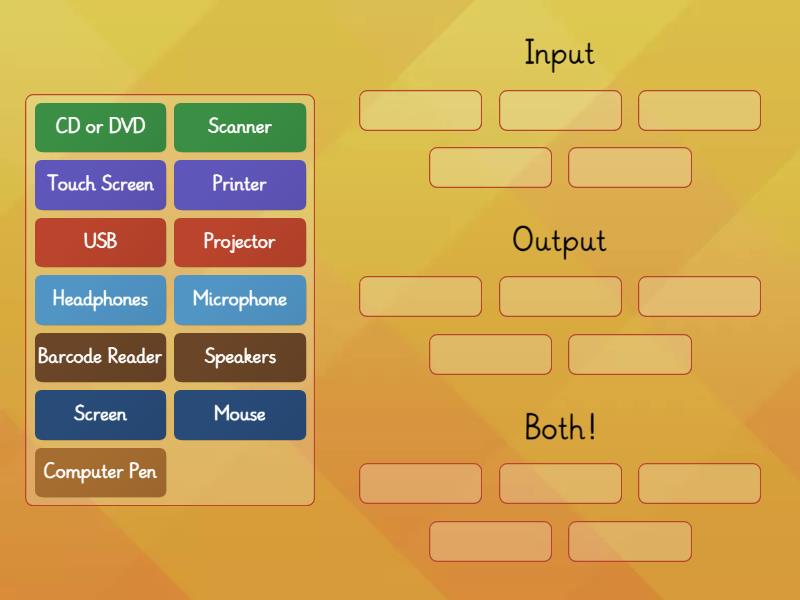 Input: Scanner, Mouse, Barcode Reader, Microphone, Computer Pen, Output: Printer, Speakers, Screen, Projector, Headphones, Both! : USB , CD or DVD, Touch Screen,
