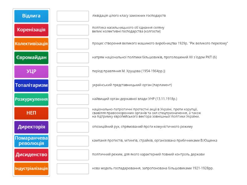 Директорія - найвищий орган державної влади УНР (13.11.1918р.), УЦР - український представницький орган (парламент), Коренізація - напрям національної політики більшовиків, проголошений ХІІ з`їздом РКП (б), НЕП - нова модель госпадарювання, запропонована більшовиками 1921-1928рр., Індустріалізація - процес створення великого машиного виробництва 1929р. "Рік великого перелому", Колективізація - політика насильницького об`єднання селяну великі колективні господарства (колгоспи), Тоталітаризм - політичний режим, для якого характерний повний контроль держави, Розкуркулення - ліквідація цілого класу заможних господарств, Відлига - період правляння М. Хрущова (1954-1964рр.)), Дисиденство - опозиційний рух, спрямований проти комуністичного режиму, Помаранчева революція - кампанія протестів, мітингів, страйків, організована прибічниками В.Ющенка, Євромайдан - національно-патріотичні протестні акції в Україні, проти корупції, свавілля правоохоронних органів та сил спецпризначення, а також на підтримку європейського вектора зовнішньої політики України.,