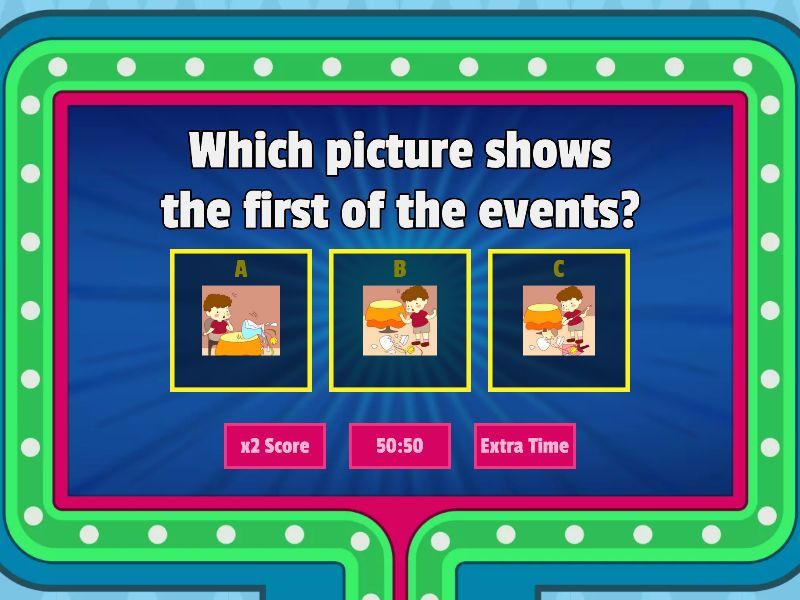 1) Which picture shows the first of the events? a) b) c) 2) Which picture shows the last of the events? a) b) c) 3) Which picture shows the last of the events? a) b) J c) 4) Which picture shows the last of the events? a) b) c) 5) Which picture shows what happens first? a) b) c)