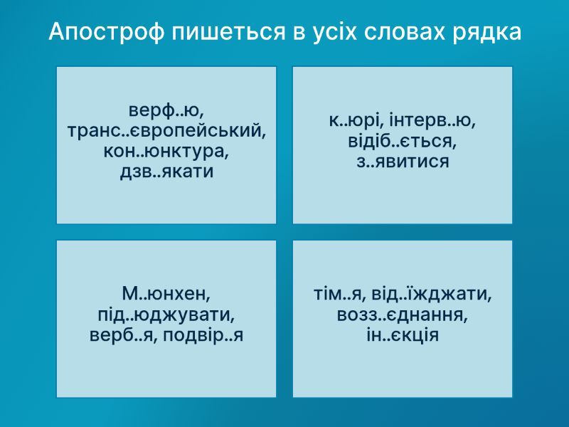 1) Позначте рядок, у якому усі слова пишуться з апострофом. a) м..ятний, роз..ятрений, присв..ята, пом..якшити b) дит..ясла, зім..ятий, верф..ю, ін..єкція c) об..єкт, дзв..якнути, зв..язок, кров..ю d) В..ячеслав, п..юре, круп..яний, між..ярусний 2) Позначте рядок, у якому усі слова пишуться з апострофом. a) в..язати, моркв..яний, комп..ютер, кур..єр b) дит..ясла, зім..ятий, верф..ю, ін..єкція c) пір..я, з..їсти, присв..ячений, п..єдестал d) солов..ї, тьм..яно, кон..юнктивіт, грав..юра 3) Позначте рядок, у якому в усіх словах пишемо апостроф. a) зів..ялий, горохв..яник, зарум..янитися, дріб..язковий b) в..юнкий, духм..яний, торф..яний, підв..язати c) вольтер..янець, мін..юст, відв..язати, круп..яний d) невід..ємний, розм...якнути, медв..яний, від..їжджати 4) Апостроф пишеться в усіх словах рядка. a) верхів..я, довір..я, різдв..яний, пов..язаний b) мін..юст, верб..я, перемир..я, інтерв..ю c) круп..є, міжбрів..я, р..яска, з..юрмитися d) сузір..я, під..яремний, зв..язківець, б..юджет 5) Апостроф пишеться в усіх словах рядка a) верф..ю, транс..європейський, кон..юнктура, дзв..якати b) к..юрі, інтерв..ю, відіб..ється, з..явитися c) М..юнхен, під..юджувати, верб..я, подвір..я d) тім..я, від..їжджати, возз..єднання, ін..єкція 6) Апостроф пишеться в усіх словах рядка a) марнослів..я, зв..язківець, скип..ятити, без..ініціативний b) подвір..я, пан..європейський, р..яжанка, трав..янистий c) торф..яний, між..ярусний, кон..юнктура, дев..яносто d) львів..янин, підрум..янений, з..являтися, ф..юзеляж 7) Апостроф не пишеться в усіх словах рядка a) верб..я, кур..йозний, тьм..яний b) моркв..яний, розз..явити, цв..яшок c) дво..ярусний, різьб..яр, Лук..янович d) духм..яний, присв..ята, прим..ятий 8) Апостроф на місці пропуску треба писати в усіх словах рядка a) черв..ячок, в..юнкий, р..юмсати b) пір..їнка, трав..янистий, зів..яти c) без..іменний, п..єса, з..єднаний d) міл..ярд, жнив..яний, пред..явник 9) Апостроф на місці пропуску треба писати в усіх словах рядка a) велике сузір..я, роз..ятрена рана b) гарне ім..я, швидкий пор..ятунок c) очікувана прем..єра, духм..яна страва d) досвідчений різьб..яр, високий бур..ян 10) Апостроф треба писати на місці пропуску в усіх словах рядка, ОКРІМ a) розм..якнути, бультер..єр, Лук..ян, різнобарв..я b) рум..янець, кон..юнктивіт, інтерв..ю, В..єтнам c) відв..язати, дит..ясла, бар..єрний, Аліґ..єрі d) солов..їний, Мін..юст, інтер..єр, між..ярусний 11) Апостроф на місці пропуску треба писати в усіх словах рядка a) зім..ятий, реп..ях, жираф..ячий b) кав..ярня, черв..як, медв..яний c) матір..ю, між..ярусний, бур..ячок d) тім..я, розв..язання, св..ятковий 12) Апостроф треба писати на місці пропуску в усіх словах рядка a) миш..як, різьб..ярство, нав..ючений b) під..юдити, грав..юра, слов..янин c) В..ячеслав, Св..ятослав, Х..юстон d) з..явитися, надвечір..я, ін..єкція