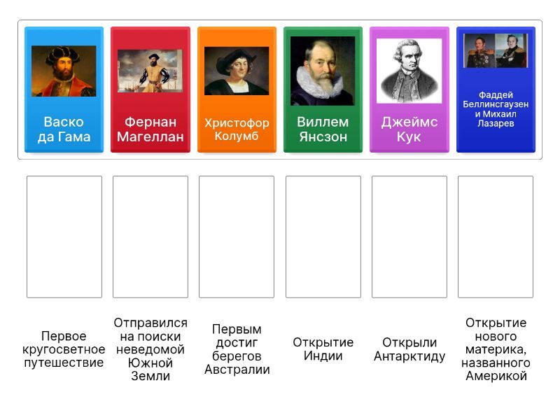 Христофор Колумб - Открытие нового материка, названного Америкой , Васко да Гама - Открытие Индии, Фернан Магеллан - Первое кругосветное путешествие , Виллем Янсзон - Первым достиг берегов Австралии, Джеймс Кук - Отправился на поиски неведомой Южной Земли, Фаддей Беллинсгаузен и Михаил Лазарев - Открыли Антарктиду,