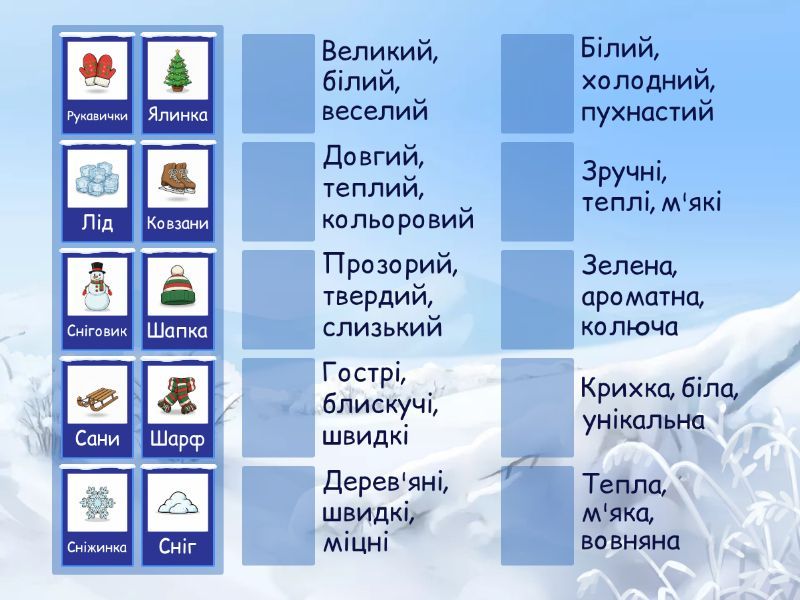 Сніг - Білий, холодний, пухнастий, Лід - Прозорий, твердий, слизький, Шапка - Тепла, м'яка, вовняна, Шарф - Довгий, теплий, кольоровий, Рукавички - Зручні, теплі, м'які, Ковзани - Гострі, блискучі, швидкі, Сани - Дерев'яні, швидкі, міцні, Сніговик - Великий, білий, веселий, Ялинка - Зелена, ароматна, колюча, Сніжинка - Крихка, біла, унікальна,