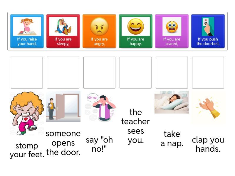 If you push the doorbell, - someone opens the door., If you raise your hand, - the teacher sees you., If you are happy, - clap you hands., If you are angry, - stomp your feet., If you are scared, - say "oh no!", If you are sleepy, - take a nap. ,