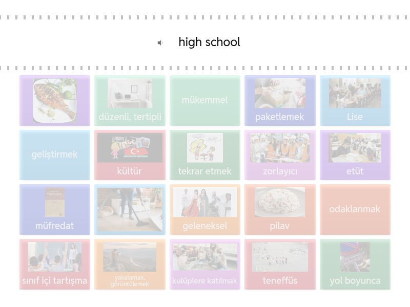 Lise - high school , kültür - culture, geleneksel - traditional, tekrar etmek - go over, zorlayıcı - challenging , müfredat - curriculum , mükemmel - excellence, odaklanmak - focus on , etüt - cram school, geliştirmek - to develop, sınıf içi tartışma - classroom discussions, yakalamak, görüntülemek - to capture, yol boyunca - along the way , kulüplere katılmak - to join clubs, paketlemek - pack, düzenli, tertipli - neatly , pilav - rice , grilled fish, household chores , teneffüs - break,