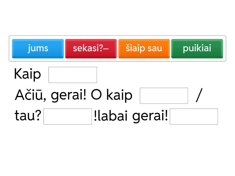Kaip ____ Ačiū, gerai! O kaip ____ / tau?____!labai gerai!____ Iš ____ jūs ____ Aš ____ iš ____, iš Hamburgo. O jūs?– Aš esu ____ Latvijos, iš ____. ____ mano draugas Paulius.– Malonu. Aš ____. Čia mano ____ Alicija. – Malonu. ____ vardas Viktoras. Labas, Rūta! ____ sekasi? Rūta: Ačiū, Andriau, ____ O tau? Andrius: Ačiū, ____ gerai Rūta! Tomas: Kaip ____ sekasi, ____ Agne? Agnė: ____, pone Tomai, gerai. Administratorė: Iš kur jūs esate, ____?Karstenas: Aš esu iš ____. Administratorė: Iš ____ Karstenas: Ne, iš Frankfurto Valerija: Aš esu iš ____. Iš ____. Iš kur tu esi, Tomai?Tomas: Aš iš ____, iš ____. Viktoras: Valentina, ____ jūs esate iš Ispanijos? Valentina: ____, Viktorai, aš esu iš ____.Viktoras: Iš Romos?Valentina: Ne, iš ____. Povilas: Marija, ____ mano draugas Petras. ____ yra iš ____, iš ____. Marija: Malonu!Petras: Man ____ malonu! Dėstytojas: ____ jūs kalbate ____ Studentas: Taip. ____ kalbu lietuviškai. Ignas: Aš ____ lietuviškai, rusiškai ir angliškai. O jūs, Viktorija? Viktorija: Aš kalbu angliškai, lietuviškai ir ____. Truputį ____ rusiškai, bet ____. Viktorija: Aš kalbu ____, angliškai ir truputį lietuviškai. Kaip jūs kalbate, ____ ____: Aš taip pat kalbu rusiškai ir ____. Truputį suprantu ir lietuviškai.