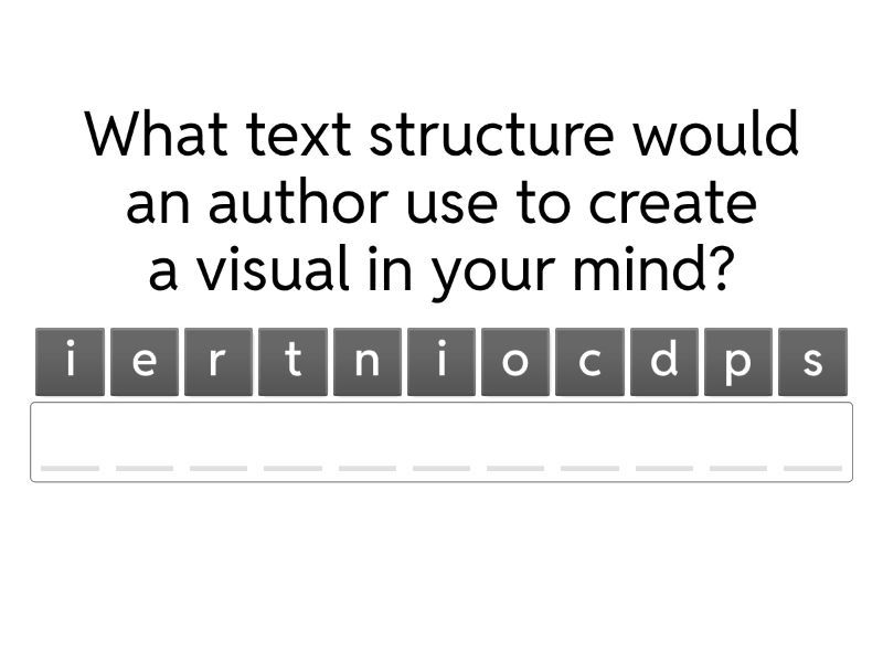description - What text structure would an author use to create a visual in your mind?, comparecontrast - What text structure explains differences and similarities?, description - What text structure uses a variety of adjectives, adverbs, and figurative language?, sequence - What text structure is an order of events, not necessarily at a specific date or time?, chronological order - What text structure is related to events in order that occur at specific dates and times?, sequence - What text structure is used in recipes?, description - What text structure is used in poetry?, description - What text structure would an author use in an encyclopedia article about the blue whale?, description - What text structure gives facts, information, and/or technical details about a topic?, comparecontrast - What text structure uses signal words like similarities, both, on the other hand, in opposition?, chronological order - What text structure would most likely be written on a timeline?, comparecontrast - What text structure would most likely be written in a Venn diagram or table?, sequence - What text structure is used when a teacher gives students instructions?, description - What text structure is used most often in fiction texts?, chronological order - What text structure would be used in a nonfiction article detailing the events of the Civil War?, sequence - What text structure is used in tutorials?, cause and effect - What text structure uses the signal words BECAUSE, AS A RESULT, IF/THEN?, cause and effect - What text structure is used in the book If You Give a Mouse a Cookie (If you give a mouse a cookie, he'll want a glass of milk.), comparecontrast - What text structure would an author use to show likenesses and differences between Disney World and Universal Studios?, problem and solution - What text structure would be used in an article that offers suggestions for combatting the effects of climate change?, problem and solution - What text structure would be best for trying to convince Americans to get a flu shot during flu season?, time - What does the prefix chronos- mean?, true - True or false? Chronological order is a type of sequence., the way an author organizes a piece of writing - What is a text structure?, true - True or false? Authors can use descriptive text structure in fiction and nonfiction., false - True or false? If a passage includes a date, it is always written in a chronological text structure., They can both describe a problem - Why are problem/solution and cause/effect text structures similar?, true - True or false? A problem can have multiple solutions and a single solution can solve multiple problems.,