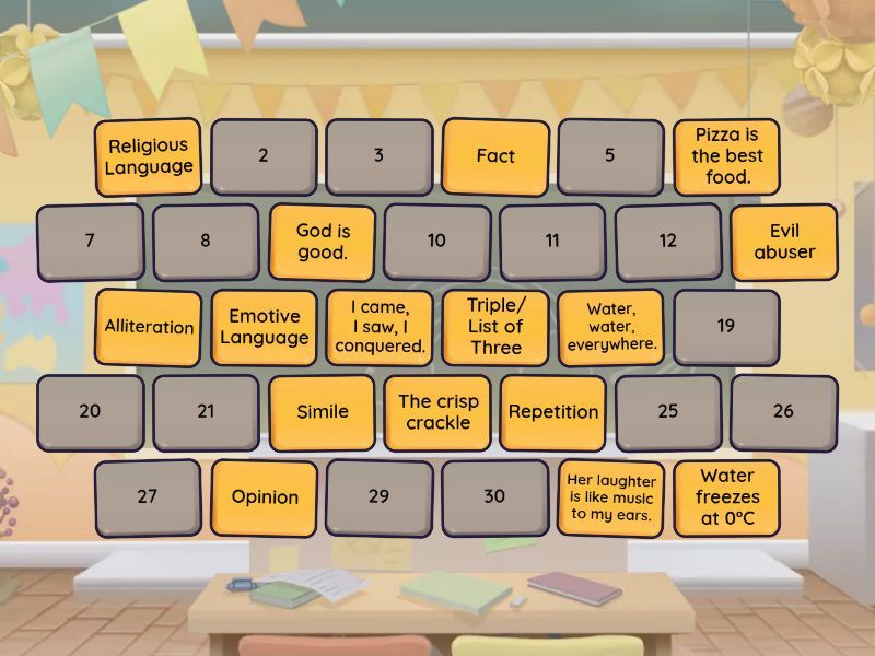 Alliteration - The crisp crackle, Fact - Water freezes at 0°C, Opinion - Pizza is the best food., Religious Language - God is good., Repetition - Water, water, everywhere., Emotive Language - Evil abuser, Triple/ List of Three - I came, I saw, I conquered., Simile - Her laughter is like music to my ears., Metaphor - The world is a stage., Noun - Eternity, university, Verb - Illustrates, describe, Hyperbole - This bag weighs a ton., Adjective - Tremendous, Personification - The wind whispered secrets., Oxymoron - Deafening silence, Onomatopoeia - Giggle, hiccup, sigh,