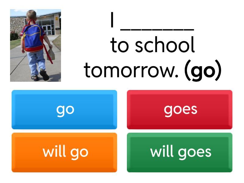 1) I _______ to school tomorrow. (go) a) go b) goes c) will go d) will goes 2) I _______ a burger tomorrow. (eat) a) eat b) ate c) will eat d) am do will eat 3) He _______ a dinosaur tomorrow. (see) a) see b) will sees c) will see d) is will do seeing 4) We _______ science tomorrow. (study) a) study b) will studies c) will study d) are will be studying 5) He __________ happy tomorrow. (be) a) be b) will is c) will be d) will are 6) My dad _______ TV tomorrow. (watch) a) watch b) is watch c) will watch d) are watch 7) My dog _______ piano tomorrow. (play) a) play b) wills plays c) will play d) will plays 8) I _______ to the movie theater tomorrow. (not go) a) not go b) don't go c) didn't go d) won't go 9) Dora _______ to school tomorrow. (not fly) a) not fly b) isn't flying c) won't fly d) won't flies 10) He ___________ happy tomorrow. (not be) a) won't be b) won't is c) won't are d) won't am 11) Jenny _______ sushi tomorrow. (not eat) a) no eat b) no will eat c) will not eat d) will not eats 12) I _________ down there tomorrow. (not go) a) am going b) will no go c) will not go d) will not am going