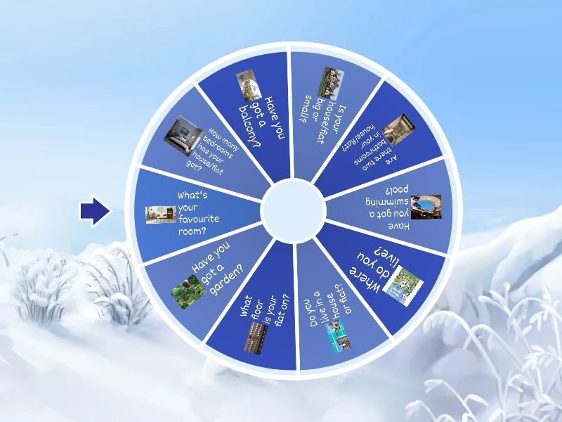 1) How many bedrooms has your house/flat got? 2) Have you got a balcony? 3) Is your house/flat big or small? 4) Are there two bathrooms in your house/flat? 5) Have you got a swimming pool? 6) Where do you live? 7) Do you live in a house or flat? 8) What floor is your flat on? 9) Have you got a garden? 10) What's your favourite room?