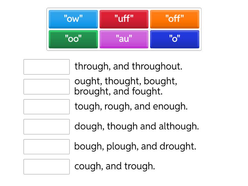 "ow" - bough, plough, and drought., "oo" - through, and throughout., "off" - cough, and trough., "au" - ought, thought, bought, brought, and fought., "uff" - tough, rough, and enough., "o" - dough, though and although.,