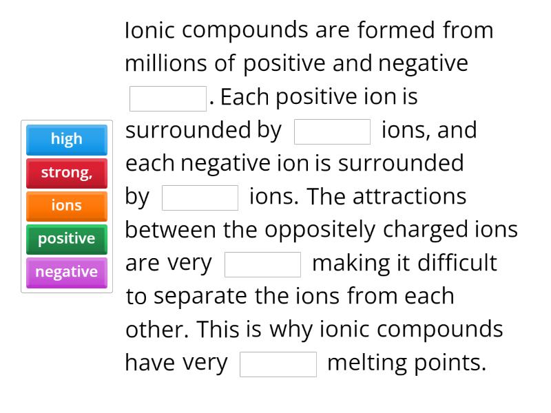 Ionic compounds are formed from millions of positive and negative ____. Each positive ion is surrounded by ____ ions, and each negative ion is surrounded by ____ ions. The attractions between the oppositely charged ions are very ____ making it difficult to separate the ions from each other. This is why ionic compounds have very ____ melting points. Ionic compounds can conduct ____ but only if they are first ____ or ____ in water. This is because the ions must be free to ____ about and carry the charge. Ionic compounds do not conduct electricity when they are ____.