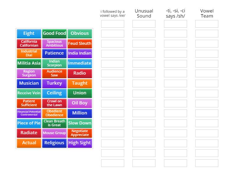 i followed by a vowel says /ee/: India Indian, Obvious, Obedient Obedience, Indian Scorpion, Radiate, Immediate, Radio, Industrial Dial, Unusual Sound: California Californian, Religious, Million, Union, Region Surgeon, Actual, -ti, -si, -ci says /sh/: Militia Asia, Musician, Spacious Ambitious, Patient Sufficient, Patience, Negotiate Appreciate, Financial Potential Controversial, Vowel Team: Piece of Pie, Turkey, Oil Boy, Audience Saw, Crawl on the Lawn, Good Food, Slow Down, Mouse Group, Clean Breath is Great, Taught, High Sight, Receive Vein, Ceiling, Eight, Feud Sleuth,