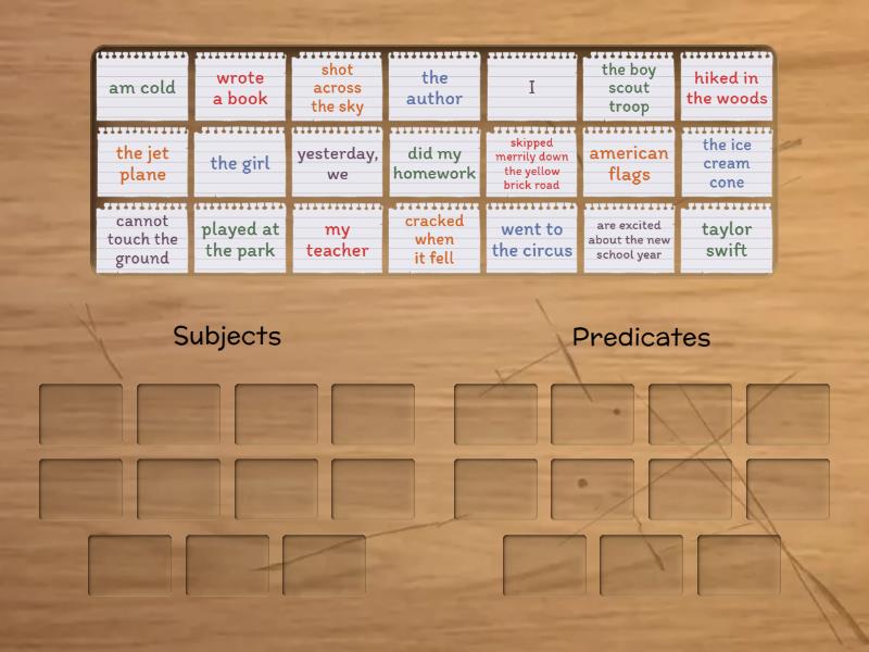 Subjects: the girl, I, the boy scout troop, my teacher, the ice cream cone, the jet plane, the author, american flags, yesterday, we , taylor swift, Predicates: hiked in the woods, cannot touch the ground, did my homework, cracked when it fell, shot across the sky, wrote a book, played at the park, skipped merrily down the yellow brick road, am cold, went to the circus, are excited about the new school year ,