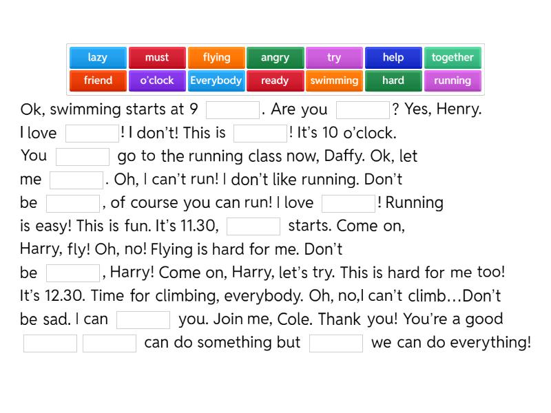 Ok, swimming starts at 9 ____. Are you ____? Yes, Henry. I love ____! I don’t! This is ____! It’s 10 o’clock. You ____ go to the running class now, Daffy. Ok, let me ____. Oh, I can’t run! I don’t like running. Don’t be ____, of course you can run! I love ____! Running is easy! This is fun. It’s 11.30, ____ starts. Come on, Harry, fly! Oh, no! Flying is hard for me. Don’t be ____, Harry! Come on, Harry, let’s try. This is hard for me too! It’s 12.30. Time for climbing, everybody. Oh, no,I can’t climb…Don’t be sad. I can ____ you. Join me, Cole. Thank you! You’re a good ________ can do something but ____ we can do everything!