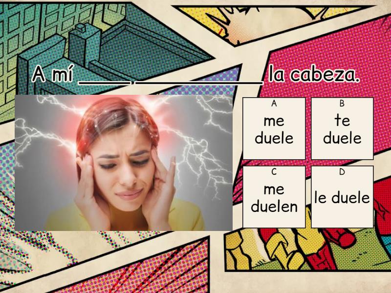 1) A mí ___ _______ los ojos. a) le duele b) me duelen c) te duele d) nos duele 2) A ellos ___ ________ el corazón. a) le duele b) les duelen c) me duele d) les duele 3) A mí ____ __________ la cabeza.  a) me duele b) te duele c) me duelen d) le duele 4) A tí ___ ___________ los dedos. a) le duele b) os duelen c) te duelen d) me duele 5) A él ___ ______ las piernas. a) me duele b) les duelen c) nos duele d) le duelen 6) A nosotros __ ______ el estómago. a) me duelen b) nos duele c) les duele d) os duelen 7) ¿A vosotros __ _______ la rodilla? a) os duele b) le duele c) nos duelen d) te duele 8) A ellos ___ _____ los pies. a) les duele b) les duelen c) le duele d) le duelen 9) A mí ___ ________ las orejas. a) me duele b) me duelen c) nos duele d) le duele 10) A tí __ ______ el codo. a) te duelen b) os duele c) te duele d) nos duele 11) A vosotros __ ______ el cuello. a) nos duele b) os duelen c) nos duelen d) os duele