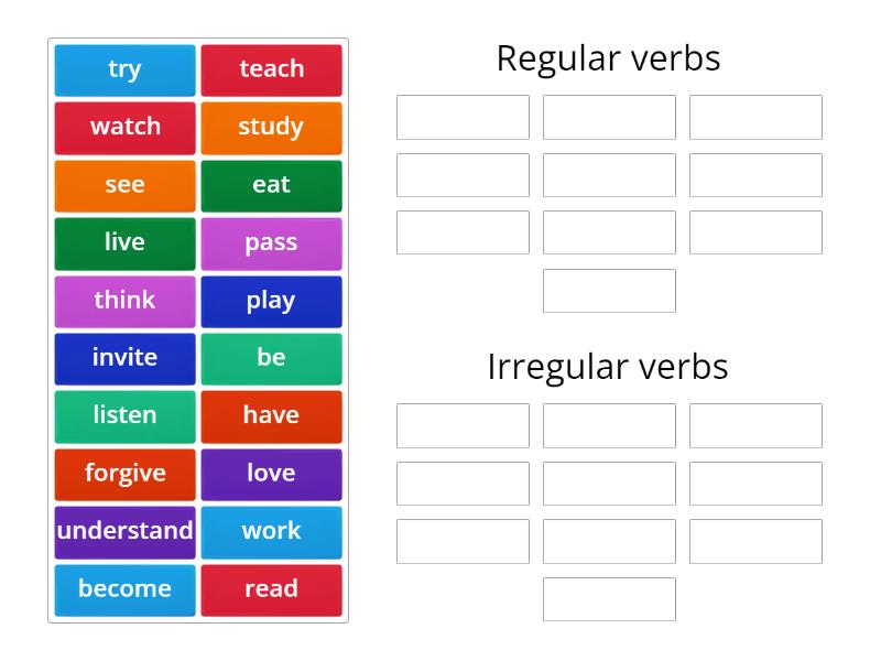 Regular verbs: live, work, study, watch, love, play, try, listen, pass, invite, Irregular verbs: be, become, see, eat, forgive, have, read, teach, think, understand,
