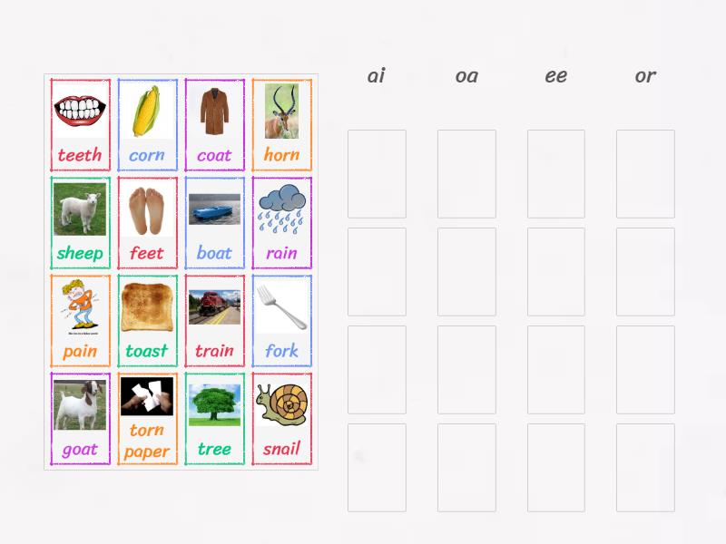 ai: rain, pain, train, snail, oa: goat, coat, boat, toast, ee: teeth, feet, tree, sheep, or: fork, torn paper, horn, corn,