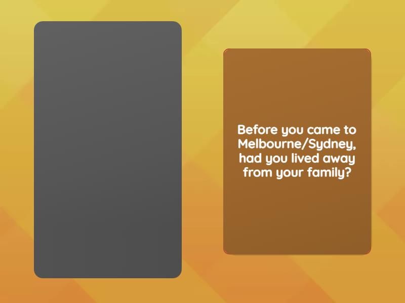 Talk about something terrible you saw: maybe an accident or something. What had happened?, Talk about a time you spoke to the police. Why did you speak to them? What had happened?, Talk about a time you missed a train/plane/bus…etc. What had happened?, Before you came to Melbourne/Sydney, how long had you studied English?, Before you came to Melbourne/Sydney, had you met anybody from Australia?, Before you came to Melbourne/Sydney, what had you expected? Did it meet your expectations?, Before you came to Melbourne/Sydney, had you spoken a lot of English? Why? , Before you came to school today, what had you already done?, Talk about a time you had an argument. Why were you arguing? What had happened?, Talk about a time a your parent was angry. What had you done?, Talk about a time your friends were angry at you. What had you done?, Before you came to Melbourne/Sydney, had you worked as a (your current job), Before you came to Melbourne/Sydney, had you done some research online? , Before you came to Melbourne/Sydney, had you lived away from your family?, Before you came to Melbourne/Sydney, had you seen a kangaroo?, Before you came to Melbourne/Sydney, which other countries had you visited?.
