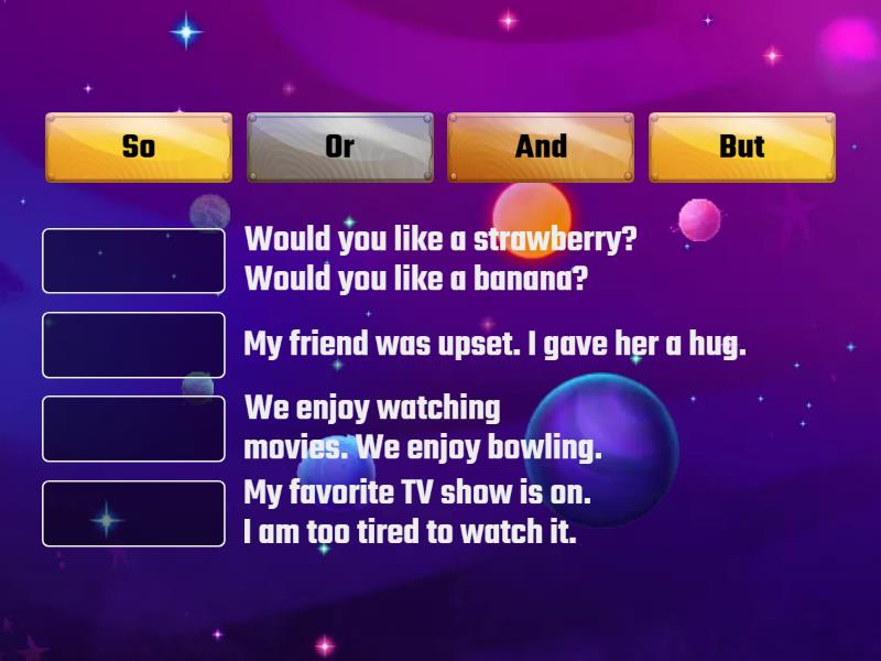 And - We enjoy watching movies. We enjoy bowling., But - My favorite TV show is on. I am too tired to watch it. , So - My friend was upset. I gave her a hug. , Or - Would you like a strawberry? Would you like a banana?,
