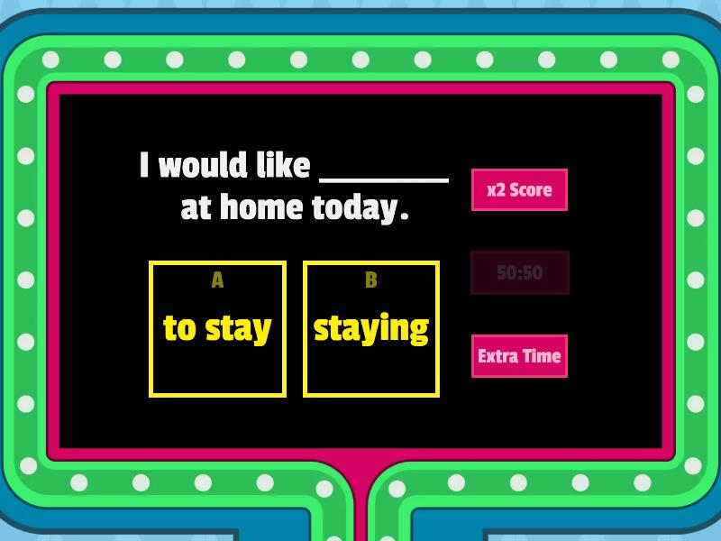 1) I would like ________ at home today. a) to stay b) staying 2) My teacher wants __________ in a new school. a) to work b) working 3) We prefer __________ outside. a) to play b) playing 4) We decided __________ for the test together. a) to revise b) revising 5) I can't stand __________ hot milk. a) to drink b) drinking 6) My father finished __________ me with Maths. a) to help b) helping 7) We hate __________ early in the morning. a) to get up b) getting up 8) Please, don't forget __________ these letters when you go out. a) to post b) posting 9) Would you like __________ something to drink? a) to have b) having 10) Please stop __________ that noise! a) to make b) making 11) Excuse me, I need __________ your pen. a) to use b) using 12) They agreed __________ on March 5th. a) to meet b) meeting 13) When did you learn __________ ? a) to swim b) swimming 14) I tried __________ her name but I couldn't. a) to remember b) remember 15) He enjoyed __________ the football match a) to watch b) watching 16) Keep __________ until you see the cinema, then turn left. a) to drive b) driving 17) Remember __________ your PE clothes to school. a) to take b) taking 18) I don't mind __________ if you can't find anyone else. a) to help b) helping 19) My mum loves __________ to the theatre. a) to go b) going