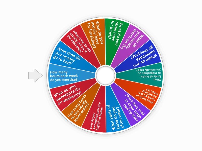 What time do you usually go to bed?, What time do you usually get up in the mornings?, What do you usually have for breakfast?, What do you often have for lunch?, What do you usually watch on TV?, Where do you sometimes go shopping?, What kinds of books or magazines do you usually read?, What kinds of music do you sometimes listen to?, How do you often relax in your free time?, What kinds of close do you often wear?, How do you sometimes practice English at home?, How many hours do you usually spend online?, What do you sometimes do on weekends?, How many hours each week do you exercise?.