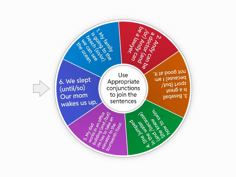 1. My family is going to the beach (so/or) we can see the ocean., 2. Andy can be a doctor (and /or) Andy can be a lawyer., 3. Baseball is a great sport (but/ because) I am not good at it., 4. She jumped in the water (and /because) She knew how to swim., 5. My dad works in an office building (and /but) He has to take an elevator to the fourteenth floor., 6. We slept (until/so) Our mom wakes us up..