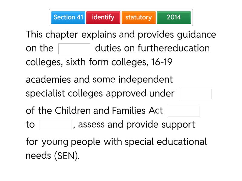 This chapter explains and provides guidance on the ____ duties on furthereducation colleges, sixth form colleges, 16-19 academies and some independent specialist colleges approved under ____ of the Children and Families Act ____ to ____, assess and provide support for young people with special educational needs (SEN). FE has the duty to ____ with the ____ on arrangements for children and young people with SEN. The duty to ____ a young person if the institution is named in an Education Health and Care (____) plan.The duty to use their best endeavours to ____ the special educational provision that the young person needs. Colleges should be ____ for young people with SEN, whatever their needs and whatever their level of study. They should focus on supporting young people so they can ____ and reach ____ destinations in ____.