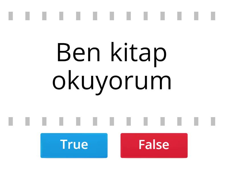 True: Ben kitap okuyorum, Sen konuşuyorsun, O konuşuyor, Biz yazıyoruz, O bakıyor, False: Ben kitap okuyorsun, Biz yüzüyorum, Ben dinliyor, Sen dinliyoruz, Ben oynuyoruz,