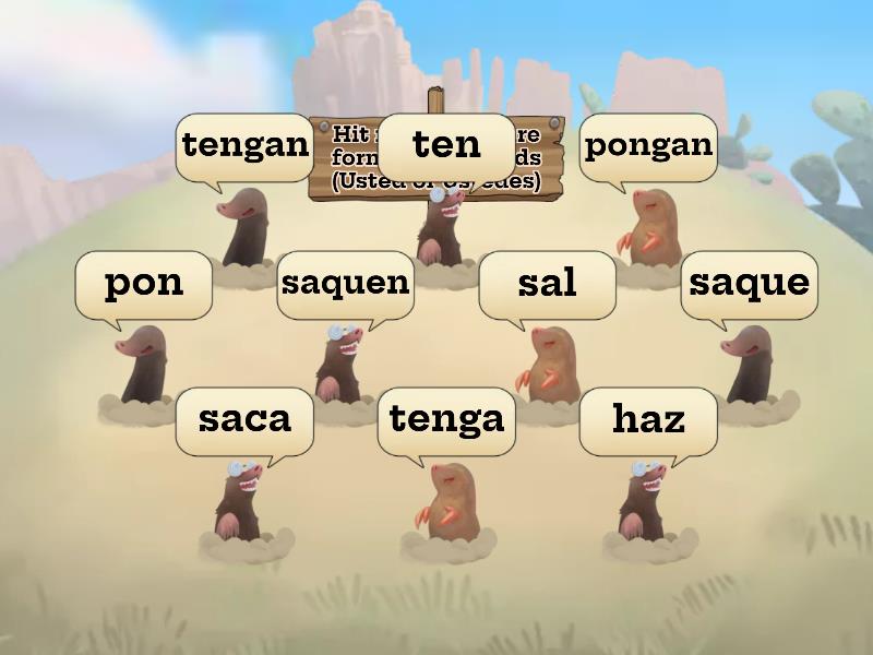 Correct: tengan, pongan, saquen, saque, tenga, escriba, beba, tome, hable, haga, hagan, vayan, vaya, coma, sea, sean, sepa, Incorrect: ten, pon, sal, saca, haz, come, habla, toma, bebe, escribe, da, ve, sé,