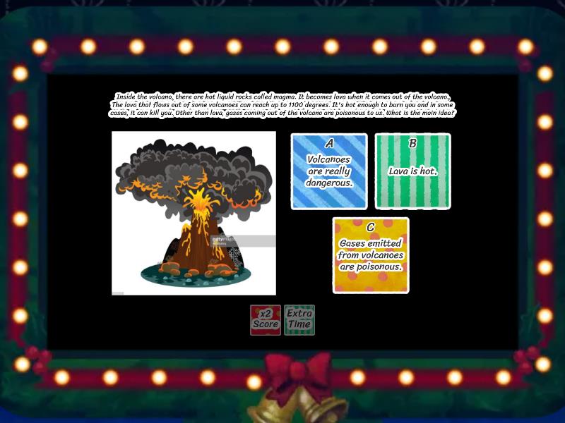 1) You learn about Science, Math, Art and many other subject areas. The school has a lot of books for you to read. The teachers create fun activities to make learning fun. There are also a lot of other kids here, who you can become friends with to study together. What is the main idea?  a) The school is a boring place to learn. b) The school is great place to learn . c) School is great place to meet new friends. 2) Inside the volcano, there are hot liquid rocks called magma. It becomes lava when it comes out of the volcano. The lava that flows out of some volcanoes can reach up to 1100 degrees. It's hot enough to burn you and in some cases, it can kill you. Other than lava, gases coming out of the volcano are poisonous to us. What is the main idea? a) Volcanoes are really dangerous. b) Lava is hot. c) Gases emitted from volcanoes are poisonous.  3) My dog is named Buddy and he learns new tricks really quickly. When I say "Hands", he will give me one of his front paws. He can even walk on two legs when I tell him to. It only took me three day to teach him these tricks. I don't think other dogs can learn as quickly as Buddy. He is a good dog. What is the main idea?  a) My dog is not clever b) My dog is the smartest dog! c) I wish I can be a good dog trainer. 4) During recess, I always go to the library because there are a lot of amazing books there. I love reading. As it is quiet, it lets me concentrate and think about different things. The librarian is really nice and friendly too. She gives me candies all the time.  What is the main idea? a) The library is my favorite place. b) It is really quiet in the library. c) I can find many books in the library. 5) You can go swimming, diving and even build your dream house using sand. If you don't like any of those activities you can play volleyball with your friends. Another good thing to do on the beach is to sunbathe. You will relax and get a tan. Don't forget the sunscreen though! What is the main idea? a) You can get bitten by jellyfish while at the beach. b) It's too hot to have fun at the beach. c) The beach is a great place to have fun.