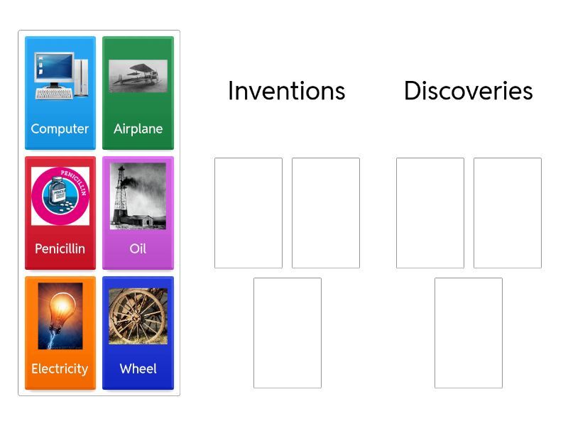 Inventions: Wheel, Airplane, Computer, Discoveries: Electricity, Penicillin, Oil,