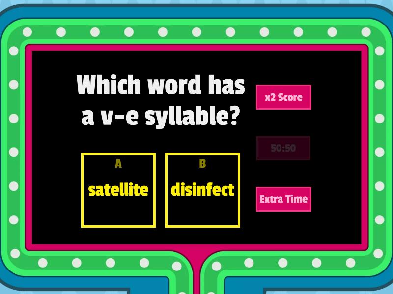 1) Which word has a v-e syllable? a) satellite b) disinfect 2) Which word has a v-e syllable? a) disconnect b) illustrate 3) Which word has a v-e syllable? a) subscribe b) establish 4) Which word has a v-e syllable? a) fantastic b) valentine 5) Which word has a v-e syllable? a) exhibit b) disinvite 6) Which word has a v-e syllable? a) timelines b) accomplish 7) Which word has a v-e syllable? a) salesman b) Atlantic 8) Which word has a v-e syllable? a) stepchildren b) demonstrate 9) Which word has a v-e syllable? a) disconnect b) distribute 10) Which word has a v-e syllable? a) rosebuds b) trespasses