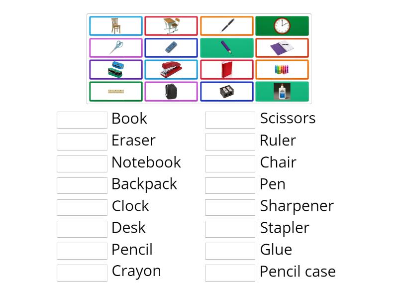Pencil, Scissors, Eraser, Glue, Book, Backpack, Ruler, Sharpener, Pen, Notebook, Desk, Stapler, Pencil case, Crayon, Clock, Chair,