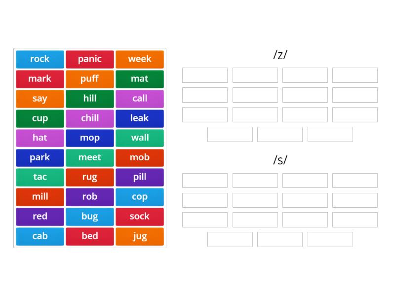 /z/: bug, rug, wall, bed, say, chill, mill, hill, pill, jug, cab, mob, rob, call, red, /s/: rock, mop, sock, park, mark, cup, cop, hat, mat, meet, week, leak, panic, tac, puff,