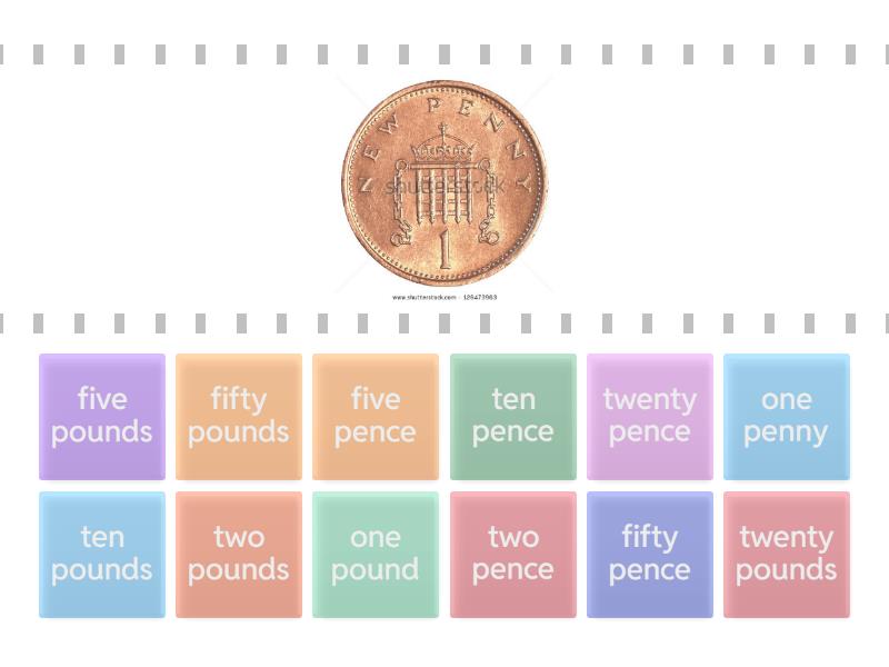 one penny, two pence, five pence, ten pence, twenty pence, fifty pence, one pound, two pounds, five pounds, ten pounds, twenty pounds, fifty pounds,