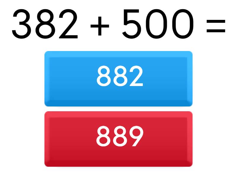 1) 382 + 500 = a) 882 b) 889 2) 258 + 400 = a) 580 b) 658 3) 318 + 200 = a) 518 b) 613 4) 732 + 100 = a) 832 b) 894 5) 311 + 600 = a) 893 b) 911 6) 480 + 100 = a) 557 b) 580 7) 623 + 100 = a) 723 b) 911 8) 226 + 300 = a) 526 b) 710 9) 385 + 400 = a) 785 b) 930 10) 498 + 500 = a) 529 b) 998
