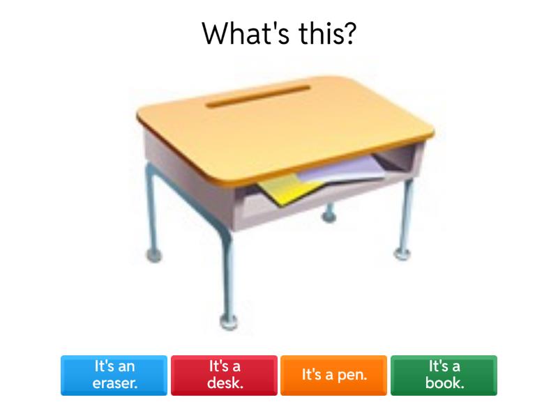 1) What's this? a) It's an eraser. b) It's a desk. c) It's a pen. d) It's a book. 2) What's this? a) It's a pencil. b) It's a ruler. c) It's a pen. d) It's an eraser. 3) What's this? a) It's a desk. b) It's a chair. c) It's a bag. d) It's a ruler. 4) What's this? a) It's a book. b) It's a desk. c) It's an eraser. d) It's a ruler. 5) What's this? a) It's a pen. b) It's a pencil. c) It,s a ruler. d) It's an eraser. 6) What's this? a) It's a desk. b) It's a chair. c) It's a book. d) It's a bag. 7) What's this? a) It's a chair. b) It's a pencil. c) It's a ruler. d) It's a desk. 8) What's this? a) It's a pen. b) It's a pencil. c) It's a book. d) It's a bag. 9) Is this a map? a) Yes, it is. b) No, it isn't 10) Is this a poster? a) Yes, it is. b) No, it isn't. 11) Is this a board? a) Yes, it is. b) No, it isn't. 12) Is this a table? a) Yes, it is. b) No, it isn't. 13) Is this a crayon? a) Yes, it is. b) No, it isn't 14) Is this a wastebasket? a) Yes, it is. b) No, it isn't 15) Is this a board? a) Yes, it is. b) No, it isn't. 16) Is this a poster? a) Yes, it is. b) No, it isn't. 17) Is this a crayon? a) Yes, it is. b) No, it isn't. 18) Is this a wastebasket? a) Yes, it is. b) No, it isn't. 19) Is this a marker? a) Yes, it is. b) No, it isn't 20) Is this a globe? a) Yes, it is. b) No, it isn't.