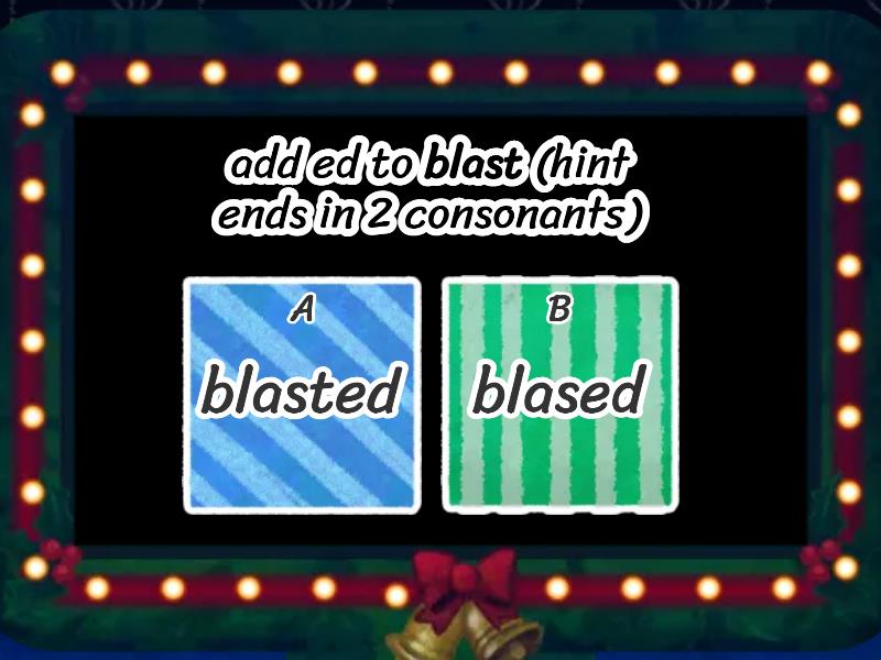 1) add ed to blast (hint ends in 2 consonants) a) blasted b) blased 2) add ing to jog (hint ends in 1 consonant- have to double) a) joging b) jogging 3) add er to rich (hint ends in 2 consonants) a) ricer b) richer 4) add est to hot (hint ends in 1 consonant- have to double) a) hottest b) hotest 5) Challenge- Can you add ed to run? a) yes -runned b) no- ran