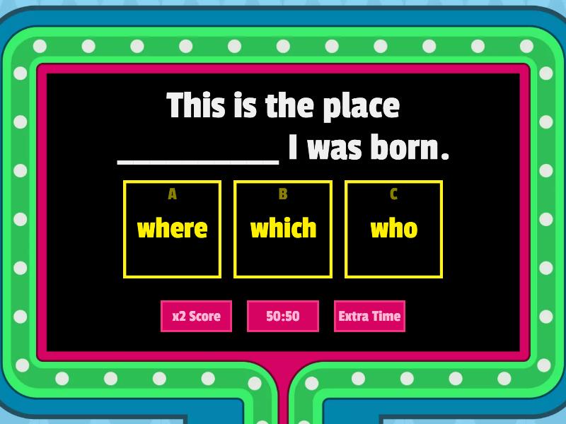 1) This is the place __________ I was born. a) where b) which c) who 2) I don’t like films _______ are sad. a) who b) that c) where 3) It’s my sister Jane_________ is the famous singer. a) where b) who c) which 4) They are the people________we met last year. a) who b) where c) which 5) Here are some tips ________can help. a) where b) that c) who 6) That’s the house______ I was born. a) where b) which c) who 7) This is the book________ I need. a) that b) where c) who 8) That’s the restaurant _______ we ate last night. a) who b) where c) which