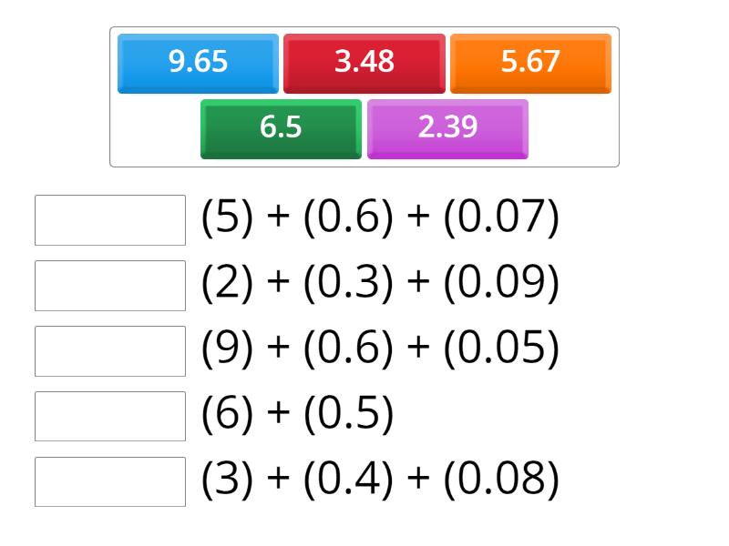 5.67 - (3) + (0.4) + (0.08), 2.39 - (6) + (0.5), 9.65 - (2) + (0.3) + (0.09), 3.48 - (5) + (0.6) + (0.07), 6.5 - (9) + (0.6) + (0.05),
