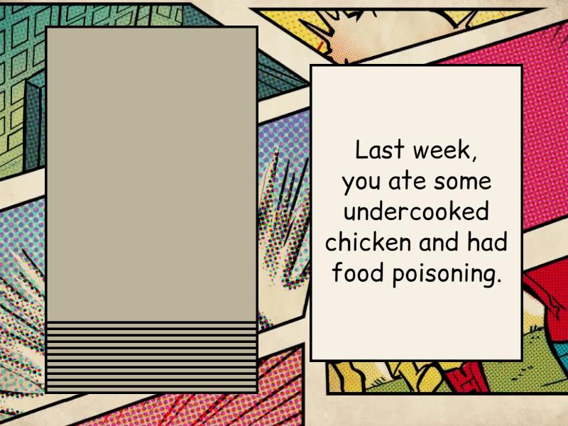Last week, you lost your passport at the airport and couldn't board the plane to go on holiday., Last week, you parked your car on the high street but didn't see the 'No parking' sign and received a parking fine., Last week, you injured your neck in a car accident because you weren't wearing a seatbelt., Last week, you took a taxi from the airport to the city centre. You found out later that the bus was a lot quicker and cheaper., Last week, you quickly paid the bill at a restaurant and later discovered the restaurant had overcharged you., Last week, you forgot to water your plants and they died., Last week, you became sick because you didn't take an umbrella when it was raining outside., Last week, you had a fight and got a black eye., Last week, you had a good idea for a new product and got promoted., Last week, you were invited to a party. At the party, you met your favourite actor., Last week, you cancelled an appointment with the dentist and later you had a terrible toothache., Last week, you found $200 in the street and bought a new mobile phone., Last week, you ate some undercooked chicken and had food poisoning..
